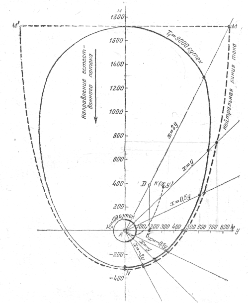 а) положение нейтральных или раздельных линий тока, которыми в плане ограничивается область питания или область захвата водозабора;