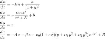 где n(t) ‑ концентрация оксида азота в стенке артерии, x(t) ‑ усредненная по объему стенки концентрация ионов кальция в гладкомышечном слое, y(t) = (R(t)-R0)/R0 ‑ относительное отклонение радиуса артерии от равновесного, z(t) ‑ скорость осцилляций радиуса сосуда.