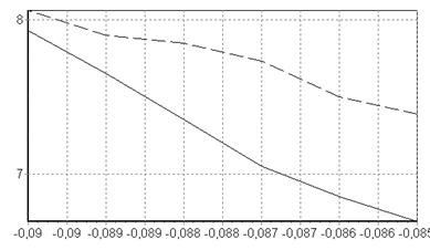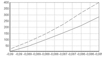 . Результаты моделирования приведены на рис. 5.4 и 5.5. Сплошной линией на рисунках указаны изменения функционалов для синтезированного управления, а пунктирной линией – для программного. Как видно из рисунков синтезированное управление при вариации начальных условий сохраняет лучшие значения обоих функционалов, чем программное.