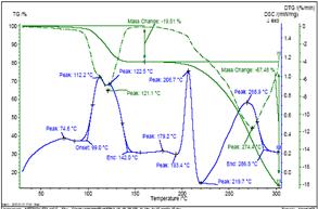Изучив кристаллический продукт 5 методом ДСК-ТГ (рис.4), мы пришли к выводу, что фосфабетаин на основе трициклогексилфосфина и малеиновой кислоты дополнительно стабилизирован молекулой той же кислоты. Эндоэффекты при 112.2ºC и 122.5ºC сопровождаются потерей массы в количестве 19.51%, что соответствует отщеплению молекулы с массой около 100 углеродных единиц при общей массе соединения 512 углеродных единиц. Таким образом, можно уверенно говорить об отщеплении молекулы малеиновой кислоты (116 углеродных единиц) от соответствующего бетаина. Следует отметить, что полное разрушение молекулярного остова бетаина 5 происходит лишь при 288.9ºC. Температура плавления нестабилизированного малеиновой кислотой бетаина 206.7ºC.