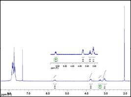 В то же время, спектр ПМР раствора продукта (рис. 8) при наличии отчетливого сигнала протонов триметилсилильной группы с химическим сдвигом 2.15 м. д. однозначно свидетельствует о процессе декарбоксилирования, который, очевидно, протекает именно в растворе за время приготовления образца и снятия спектра. Здесь доминирует триметилсилиловый эфир монокарбоксилатного бетаина (около 60% по интегральной интенсивности) с характерными мультиплетами двух неэквивалентных метиленовых групп при 3.0 и 3.7. м. д. При этом, однако, отчетливо видны также и протоны метиленовой (3.4 м. д.) и метиновой (5.5. м. д.) групп дикарбоксильного производного 25.
