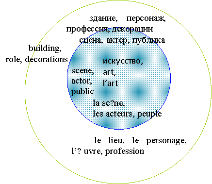 Таким образом, к ядру относятся такие слова, как: род искусства, сценическое действие; art, dramatic performance; l’art, dramatique соответственно для английского и французского языков. К области ближней периферии можно отнести: сцена, актер, публика, scene, actor, public, la scène, les acteurs, peuple. К области дальней периферии относятся: здание, персонаж, декорации, профессия, building, role, les decorations, profession, le lieu, le personage, l’œuvre, la profession (3, 389), (7, 268), (12, 1762).