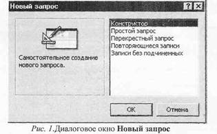 Запросы нажать кнопку Создать. Появится окно Новый запрос для выбора способа построения запроса (рис 1).