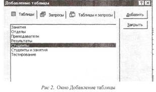 Окно Добавление таблицы состоит из трех вкладок, содержащих перечни объектов, предлагаемых программой для проектирования запроса: Таблицы, Запросы и Таблицы и запросы. При выборе вкладки Таблицы следует выделить нужную нам таблицу из предложенного списка и с помощью кнопки Добавить можно добавить несколько таблиц. Например, на рис.2 выбрана таблица Студенты.