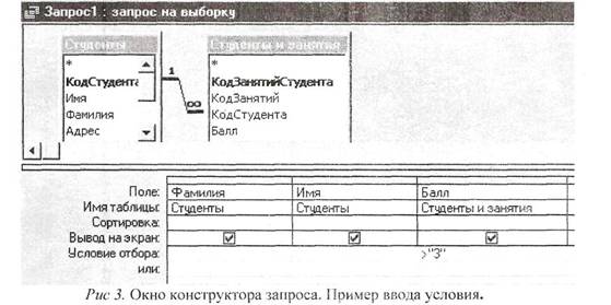 Например, на рис.3 в бланк запроса включены поля Фамилия, Имя из таблицы Студент и Балл из таблицы Студенты и Занятия.