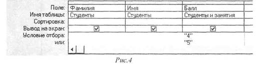 Например, как показано на рис.3, построен запрос, по которому из данных по баллам будут выбраны фамилии и имена студентов с оценками только 4 и 5.