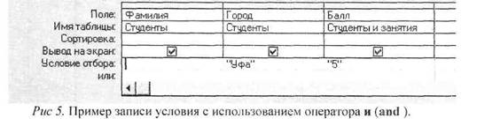 Например, на рис. 5 показано, как можно задать условие для выбора фамилий студентов, проживающих в городе Уфе, которые учатся только на 5.