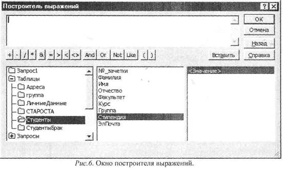 При создании выражений для вычисляемых полей можно использовать кнопку ™ Построить. Для этого нужно щелкнуть по пустому полю в бланке QBE, а затем по кнопке панели инструментов Построить. При этом откроется окно Построитель выражений (рис.6)