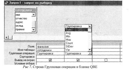 В результате чего в бланке запроса появится строка Групповая операция. Если для соответствующего поля из списка выбрать функцию Группировка (рис. 7), то при выполнении запроса записи по этому полю группируются по значениям в этом иппр и<~> итог не подводится.
