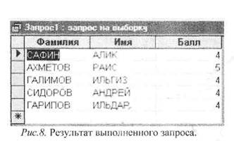 Готовый запрос выполняется после щелчка по кнопке !.панели инструментов в режиме Конструктора запросов или при активизации команды Запуск из меню Запрос. В результате будет получена таблица с ответом на заданные условия. Например, на рис 8 показан результат запроса, построенного на рис. 3.