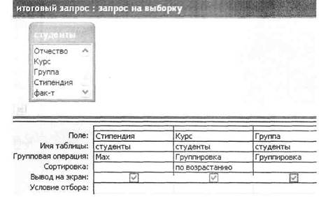 · вычислить максимальную стипендию для каждого курса каждой группы (как показано на рисунке);