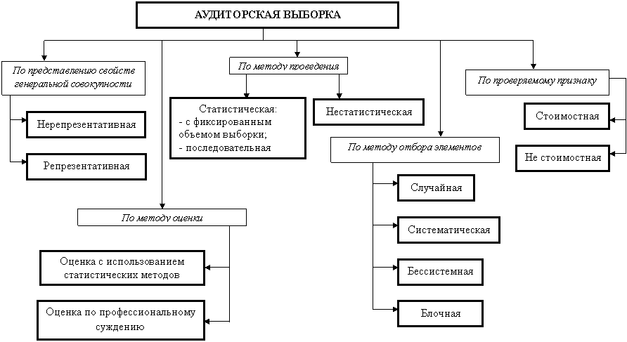 2.1. Классификация аудиторских выборок. В практике аудиторской деятельности находят применение сплошной и выборочный методы проверки. Выбор одного из двух методов зависит от целого ряда условий: характера аудиторского задания, количества элементов проверки, профессионализма аудитора, состояния системы бухгалтерского учета и внутреннего контроля экономического субъекта и др.