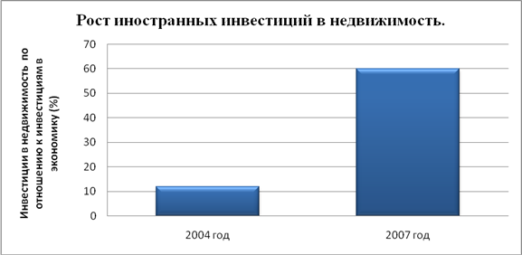 Сразу после вступления Евросоюз в страну пришли крупные игроки - девелоперские компании и инвестиционные фонды. Все это в конечном итоге благоприятно отразилось на рынке местной недвижимости. Ведь пришедшие «монстры», обладая значительными финансовыми ресурсами, стали реализовывать более масштабные проекты, довольствуясь при этом меньшей доходностью. В результате чего произошло общее снижение рентабельности проектов коммерческой недвижимости, прежде всего в столице. С одной стороны это плохо, но с другой стороны все это дало мощный импульс для развития экономики и формирования рынка недвижимости Болгарии, что в свою очередь сделало вложения «частных инвесторов» в эту солнечную страну еще более привлекательными. По данным материалов Форума «Возможности для инвестирования в один из самых динамичных рынков недвижимого имущество – Болгарию», проведенным Посольством Республики Болгария, в отличие от других стран ЦВЕ, близких по месторасположению к ЕС, Болгария очень долго была изолирована от инвестиционного интереса. Политическая обстановка и соседство с Югославией отрицательно влияло на развитие Болгарии, включая развитие рынка недвижимости. В настоящее время ЕС и бывшие страны соцлагеря направили свой инвестиционный поток на сектор недвижимости Болгарии. Об этом свидетельствуют не только многочисленные программы ЕС, но и специальные финансовые организации. К примеру, венгерская фирма «Тригранит» инвестирует в недвижимость в Болгарии свыше 300 миллионов евро. Голландский гигант ING в прошлом году создал один из крупнейших инвестиционных фондов Центральной Европы, направленный на инвестиции в недвижимость Болгарии. В результате наблюдается рост инвестиций в недвижимость по отношению к инвестициям в экономику страны с 12% в 2004 году до 60% в 2007 году. (Диаграмма 26).
