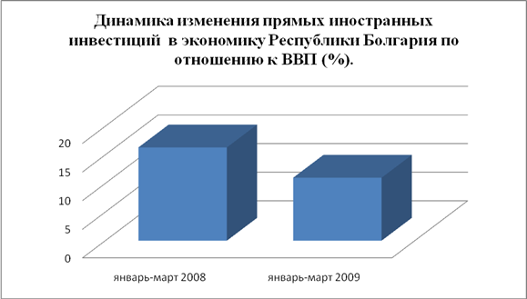 Последствия глобального финансово-экономического кризиса начали ощущаться в Болгарии в сентябре 2008 года. Появились симптомы ухудшения хозяйственной конъюнктуры: уменьшение числа заказов, увольнение рабочих, остановка производства, более строгое предоставление кредитов банками на реальную экономику. Оптимизм бизнеса в первые 6 месяцев 2008 года сменился негативными ожиданиями. По данным Национального института статистики, нагрузка на производственные мощности в октябре 2008 года составляла 74%. Предприниматели считают, что конкурентоспособная позиция болгарских предприятий и на международных, и на внутреннем рынке, ухудшилась. С тем, чтобы увеличить возможности коммерческих банков кредитовать бизнес, Болгарский народный банк принял решение снизить размер обязательных резервов банков с 12 на 10%, что позволило освободить ресурс в размере 500 млн. евро. По предварительным данным Болгарского народного банка, прямые иностранные инвестиции снизились до 11% ВВП страны на конец марта 2009 года, по сравнению с тем же периодом минувшего года, когда размер инвестиций составлял 16,3% ВВП. (Диаграмма 27)[9].