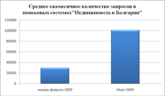 Согласно исследованиям портала «***** – недвижимость за рубежом», в первом квартале 2009 года болгарский рынок уверенно занимает первое место в рейтинге интереса российского потребителя зарубежной недвижимости. Исследование основывается на анализе количества запросов к базе объектов недвижимости, размещенных на портале. В январе-феврале 2009 года 21,27% всех запросов было сделано именно по Болгарии (Диаграмма 28)[12]. По данным компании «1Вебстудия», специализирующейся на продвижении сайтов, средневзвешенное ежемесячное количество запросов в поисковых системах «Недвижимость Болгарии» с января 2009 года по март 2009 года возросло более чем в 3 раза. (Диаграмма 29).