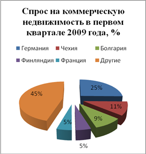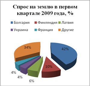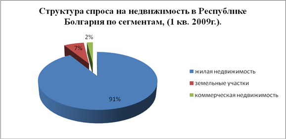 Если делить рынок по сегментам, то в первом квартале 2009 года, 91,26% запросов по Болгарии касались жилой недвижимости, 6,76% – земельных участков, а 1,98% – коммерческих объектов. Это подтверждает и Алексей Коновалов, главный редактор «*****», утверждающий, что россияне, в основном, покупают дома и участки земли. Коммерческая недвижимость их не очень интересует. (Диаграмма 30) [12].