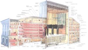 Подобным же образом были устроены и другие английские театры. Постройка представляла собой от крытый двор, где ходила, стояла или сидела на ящиках и корзинах публика, купившая дешёвые билеты. Места на галереях, окружавших двор, стоили дороже - там зрители удобно располагались на скамьях и были укрыты от непогоды. Над простой дощатой сценой, прикрытой навесом от дождя, высилась башенка, на которой в день спектакля вывешивался флаг. Театры в Лондоне строили за чертой городского центра, на другом берегу Темзы, и, если утром жители города видели флаг, они знали, что сегодня будет представление. Сев в лодки, прихватив с собой корзины с провизией и тёплые накидки, люди переплывали реку и шли в театр, где спектакли длились несколько часов подряд, пока не темнело.