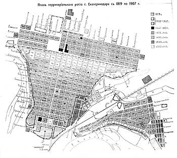 Судя по первым планам Екатеринодара (1795 и 1799 гг.), изначально город был распланирован до нынешней улицы им. Горького на севере и улицы им. Пушкина на юге; далее в 200 метрах находилась крепость. На планах видны места для площадей, торговых лавок, церкви, указаны кварталы, которые в этот период уже застраивались. За городом, на выгонных землях, примерно в 200 м от жилья было отведено место для городского кладбища (ныне территория 1-й клинической больницы и восточной части колхозного рынка). Впрочем, есть мнение, что первоначально город с севера замыкала улица Мира (улицы Екатеринодара еще много лет не имели названий и для удобства изложения мы будем использовать современное их наименование) и выгонные земли для выпаса скота находились к северу от нее, а на перекрестке улиц Мира и Шаумяна находилось болото и по нему плавали дикие утки.