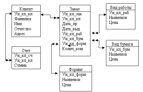 С учетом изложенного в нашей модели необходимо изменить список атрибутов сущности «Заказ» и добавить новые сущности: вид работы, счет, формат, вид бумаги.
