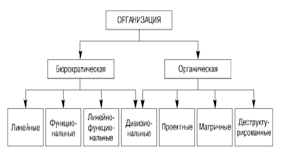 Существуют разнообразные альтернативные варианты построения организационных структур. Можно выделить три крупные группы организационных структур — бюрократические (механистические), дивизиональные и программно-целевые. Рассмотрим сущность, основные черты и классификацию этих организационных структур.
