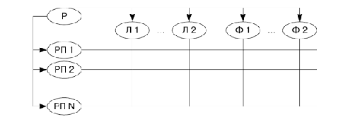 Рис. 8. Матричная структура управления: Р руководитель организации; РП руководитель проекта; Л линейный руководитель; Ф функциональный руководитель