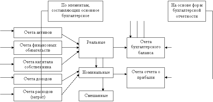 Распространенным подходом к классификации бухгалтерских счетов является отнесение счетов активов, финансовых обязательств и капитала собственника к группе так называемых реальных счетов, а счетов доходов и расходов (затрат) — к группе так называемых номинальных счетов.