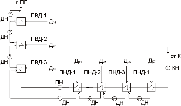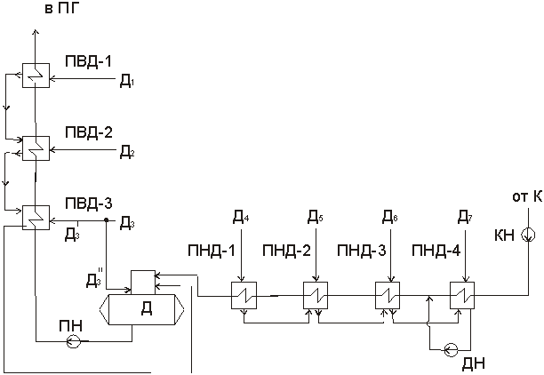 2. Система регенеративного подогрева питательной воды включает 10 ступеней: три подогревателя высокого давления (ПВД-1,2,3), деаэратор (Д), четыре подогревателя низкого давления (ПНД-1,2,3,4), теплообменник пара сальниковых уплотнений (ТПСУ) и теплообменник пара эжекторов (ТПЭ), утилизирующий теплоту отработавшего в эжекторах пара на подогрев питательной воды.