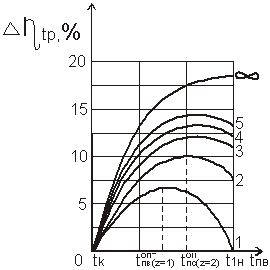 В обоих случаях регенеративный подогрев отсутствует, т. к. при tк подогрев питательной воды не осуществляется, а при температуре t1н возможно использование только свежего пара, что не является регенеративным подогревом (регенеративный подогрев реализуется частично отработавшим паром в турбине). Следовательно, в обоих крайних случаях изменение термического к. п.д. от регенеративного подогрева Dηtp = 0. Вместе с этим регенеративный подогрев всегда дает положительный результат Dηtp > 0 (см. 2.4.1.), а совокупность положительных значений между двумя нулевыми значениями (tк и t1н) имеет максимум (Dηtp = max), соответствующий оптимальной температуре регенеративного нагрева питательной воды, обеспечивающую минимальную энергетическую эффективность подогрева. Это иллюстрируется графиками на рисунке 2.17, полученными в результате термодинамического расчета для идеальных условий при ступенчатом подогреве питательной воды.