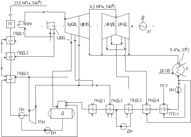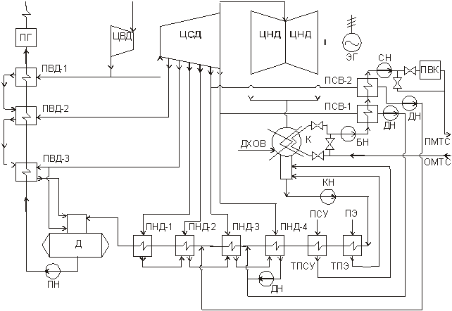 ЦВД, ЦСД, ЦНД - цилиндры высокого, среднего и низкого давлений;