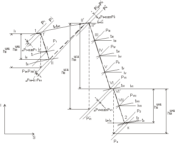 Потери давления представляются дросселированием, а точка 1΄ определяется соответственно пересечением изоэнтальпии і1 = const с изобарой Р1΄.
