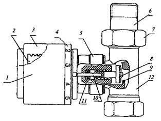 4.2 Схема одного из конструктивных вариантов исполнения терморегулятора со встроенными регулятором температуры и датчиком приведена на рисунке 2. В корпусе клапана для двухтрубных систем отопления должен быть встроен механизм предварительной гидравлической настройки.