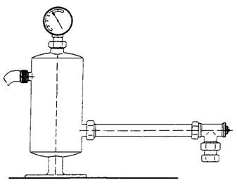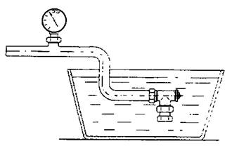 Испытание должно проводиться по схеме, указанной на рисунке 11. Терморегулятор должен быть закрыт со стороны радиатора и погружен в воду. Давление воздуха должно быть 0,02 МПа ± 10 %. Спустя одну минуту необходимо провернуть шток пять раз и проверить герметичность уплотнения штока клапана.