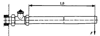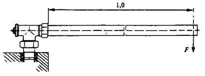 Испытание должно проводиться на стенде по рисунку 12. Необходимо затянуть соединительную гайку на трубе длиной 1,0 м в соответствии с данными таблицы 3. Прикладывают силу F к концу трубы и перпендикулярно ее оси в течение 30 с. Сила F равна изгибающему моменту в соответствии с таблицей 4.