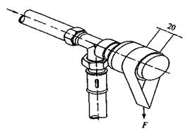 Испытание должно проводиться в соответствии со схемой, показанной на рисунке 14, при температуре воды (90±2) °С и статическом давлении 0,1 МПа в трубопроводе. Через 20 мин будет достигнуто температурное равновесие. После этого прикладывают силу F = 250 Н в течение 30 с к регулятору температуры перпендикулярно его оси. Силу прикладывают на расстоянии 10 мм от наиболее удаленного конца при помощи ленты или ремня шириной 20 мм.