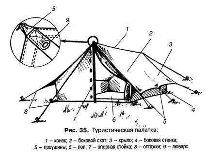 Из палаток наиболее распространены двускатные палатки в форме домика (рис. 35) с набором стоек и колышков, которые, как и палатка, убираются в чехол из плотной ткани. Несмотря на то что палатки сделаны из непромокаемой ткани, их следует покрывать специальными тентами. В каждую палатку необходим фонарик.