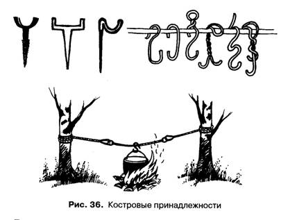К костровым принадлежностям относят тросик для подвески вёдер между деревьями, складные таганки, треноги, разборные очаги, крючки и цепочки для подвески посуды и регулирования её высоты над огнём (рис. 36). Необходимы также рукавицы, без которых невозможно работать у костра, мешалка с длинной ручкой, тент-кухня. Наиболее удобны для варки и переноски пищи так называемые каны – комплекты из 2-3 вёдер.