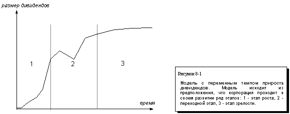 Естественно, что наиболее реалистичное предположение состоит в том, что как размер дивидендов, так и темп их прироста, год от года может меняться. Естественно, что прогнозировать размер дивидендов для каждого отдельного года - задача практически невозможная. Тем не менее, приблизить метод дисконтированных дивидендов к реальности, и, одновременно, несколько упростить задачу прогнозирования, можно, сделав предположение о том, что корпорация в своем развитии проходит ряд этапов, в каждом из которых существует своя закономерность изменения размера дивидендов. Наиболее популярный подход состоит в выделении трех основных периодов развития фирмы: