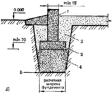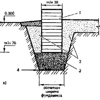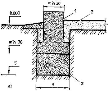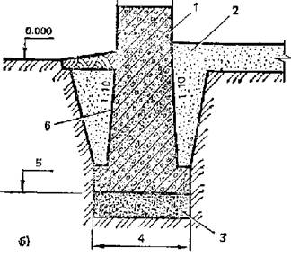 а) ленточные; б) столбчатые. 1–бетонные блоки; 2–обратная засыпка;