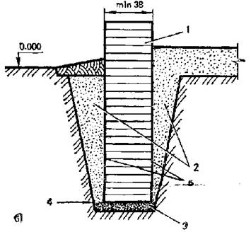 1 – кирпич; 2 – обратная засыпка; 3 – песчаная подушка; 4 – уровень заложения фундамента; 3 – штукатурка цементным раствором и обмазка битумом.