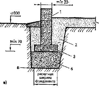 В тех случаях, когда заложение подошвы фундамента больше 1 м, стенки углубления выполняют с наклоном (откосом) к подошве, что позволяет обходиться без креплений (рис. 3,6). Откос делают таким, чтобы грунт не осыпался под собственной массой. Например, для песчаных грунтов и мокрых глин откос равен 1: 1 (рис. 3,в), то есть на метр глубины траншеи каждая стенка отклоняется от вертикали, проходящей через край подошвы также на 1 м. В сухих глинистых грунтах откос принимают равным 1 х 0, 5.