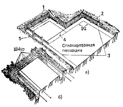 Затем на земельный участок с чертежей переносят и закрепляют в натуре оси фундамента и его размеры. Перед этим по периметру будущего котлована устанавливают так называемую обноску (рис. 2).Она состоит из погруженных в землю столбов (1), к которым строго по уровню верха будущего фундамента прибиты обрезные доски (5). На последних размечают оси (3) и размеры котлована или траншеи, а потом фундамента и стен.