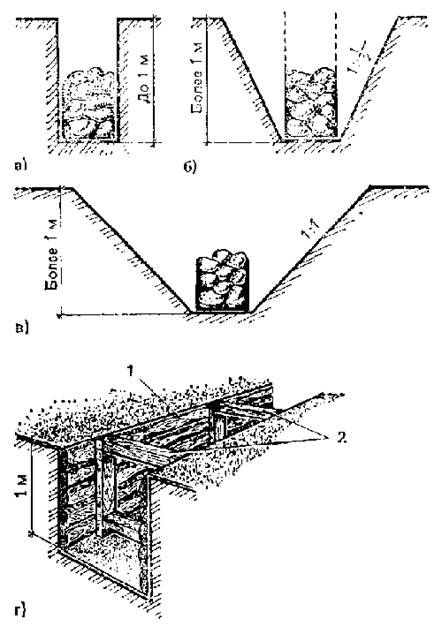 Если глубина траншей превышает 1 м, их укрепляют специальными деревянными щитами (рис. 3,г.).