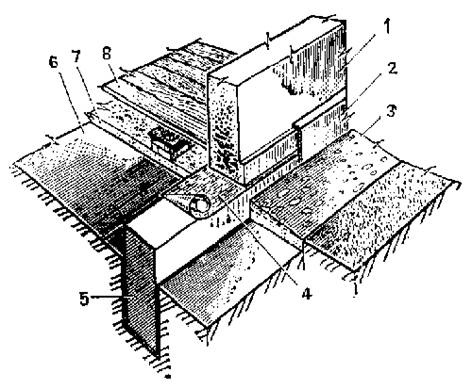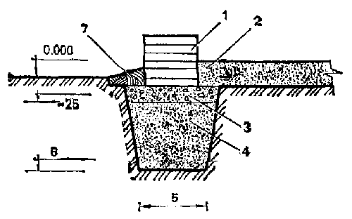 1 – цоколь; 2 – подсыпка; 3 – слой щебня, гравия или кирпичного боя толщиной 20 см с проливкой раствором; 4 – песчаный фундамент; 5 – ширина фундамента; 6 – уровень заложения; 7 – глиняный замок.