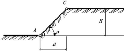Для характеристики откоса используют термины: подошва откоса (рис.9.1, точка А), бровка откоса (рис.9.1, точка С), высота откоса - Н, заложение – В. Крутизна откоса характеризуется углом наклона