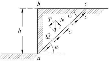 Рассмотрим условие равновесия массива связного грунта, ограниченного вертикальным откосом (рис.9.3) и обладающего только сцеплением, в предположении, что поверхность скольжения плоская. Проведем под произвольным углом