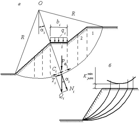 2. Методы, рассматривающие возможность разрушения откосов со смещением грунта по некоторым криволинейным поверхностям скольжения. Форма их принимается заранее (метод отсеков), а также выявляется в ходе решения (вариационные методы).