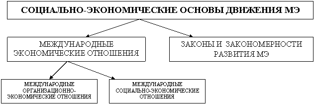 Социально-экономические основы движения МЭ представляют собой совокупность МЭО, законов и закономерностей развития МЭ (рис.3.1). МЭО охватывают международные социально-экономические отношения и международные технико-экономические отношения. Международные социально-экономические отношения характеризуются формой собственности на средства производства, которые, в свою очередь, определяют специфику международной торговли и научно-технического сотрудничества стран, валютно-финансовых и кредитных отношений.