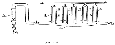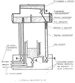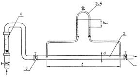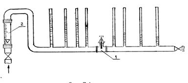 Исследуемая задвижка (1) установлена на прямом трубопроводе постоянного диаметра. Для определения расхода воды применяется ротаметр (2). На трубопроводе имеется ряд пьезометров, часть которых установлена до задвижки, а часть после нее.