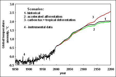 Здесь такая хвостатая кривая — это результаты инструментальных наблюдений с середины XIX в., когда у нас есть более-менее подробное представление о температуре по всему земному шару. А вот это — прогноз вашего покорного слуги на ближайшие 200 лет. Что видно из этого графика? В газетах вы прочтете, что повышение температуры с конца XIX в, когда, собственно говоря, и обозначилось повышение температуры, до нынешнего времени — это 0,5-0,6ºС, но это зависит от того, что с чем вы сравниваете. Если говорить о температуре последних пяти лет, то это уже 0,8ºС, потому что последняя пятилетка была очень теплой. Если сравнивать декадные или двадцатилетние значения, то это, действительно, будут 0,6-0,7ºС.