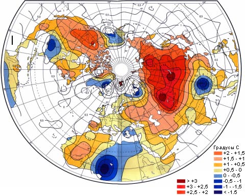 Отклонения средних температур (ºС) зимы в эпоху современного потепления (1980–1999 гг.) по сравнению с периодом (1911–1930 гг.)